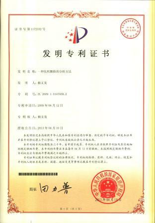 一種化積顆粒的分析方法發(fā)明專利證書 發(fā)布時(shí)間: 2019年12月18日 11:48:41 閱讀量: 10,407 下一篇:一種含有塞隆骨的藥物組合物及其制備方法和質(zhì)量控制方法發(fā)明專利證書上一篇:一種口腔消毒衛(wèi)生產(chǎn)品發(fā)明專利證書