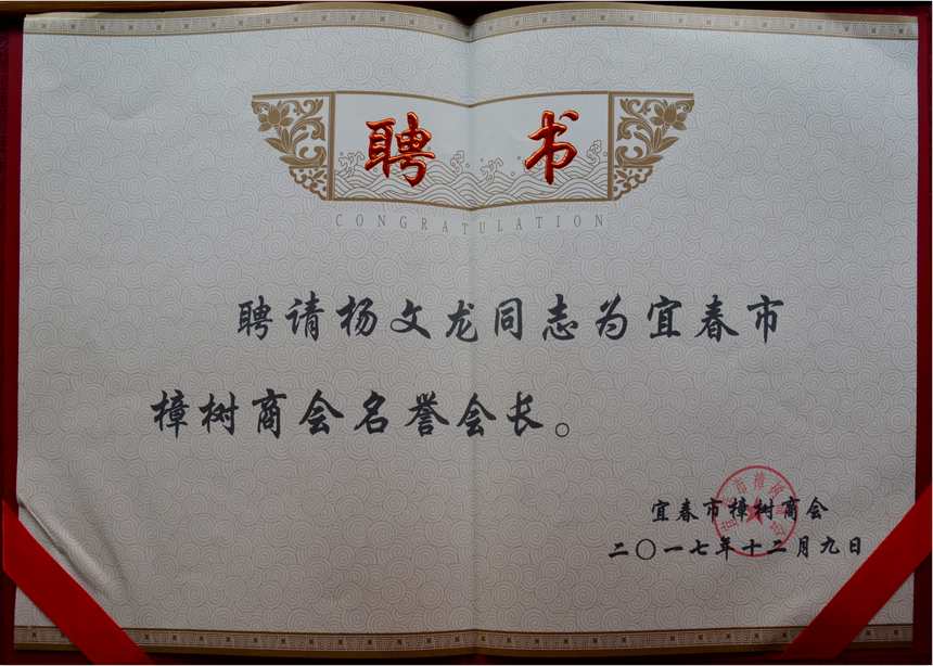 楊總當(dāng)選宜春樟樹商會(huì)名譽(yù)會(huì)長 聘書 發(fā)布時(shí)間: 2019年12月18日 16:53:43 閱讀量: 16,349 下一篇:楊總當(dāng)選宜春樟樹商會(huì)名譽(yù)會(huì)長上一篇:楊文龍董事長被評(píng)為2017年度全市“知名企業(yè)家”
